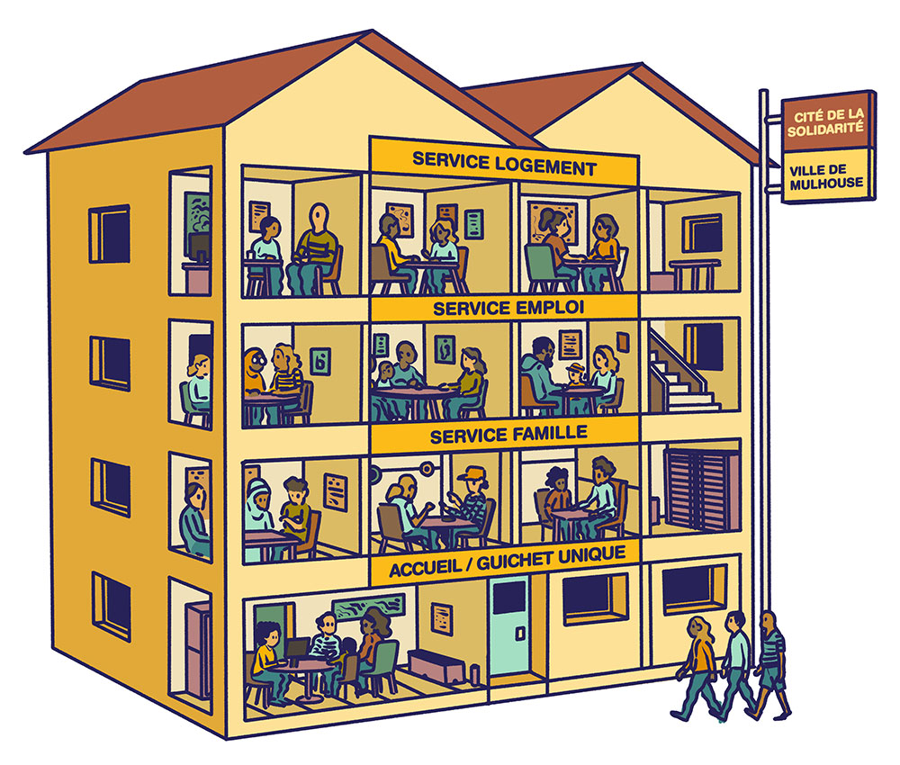 - Créer une Cité de la Solidarité à Miroir Cité qui regroupe l’ensemble des services publics sociaux à destination des Mulhousiens